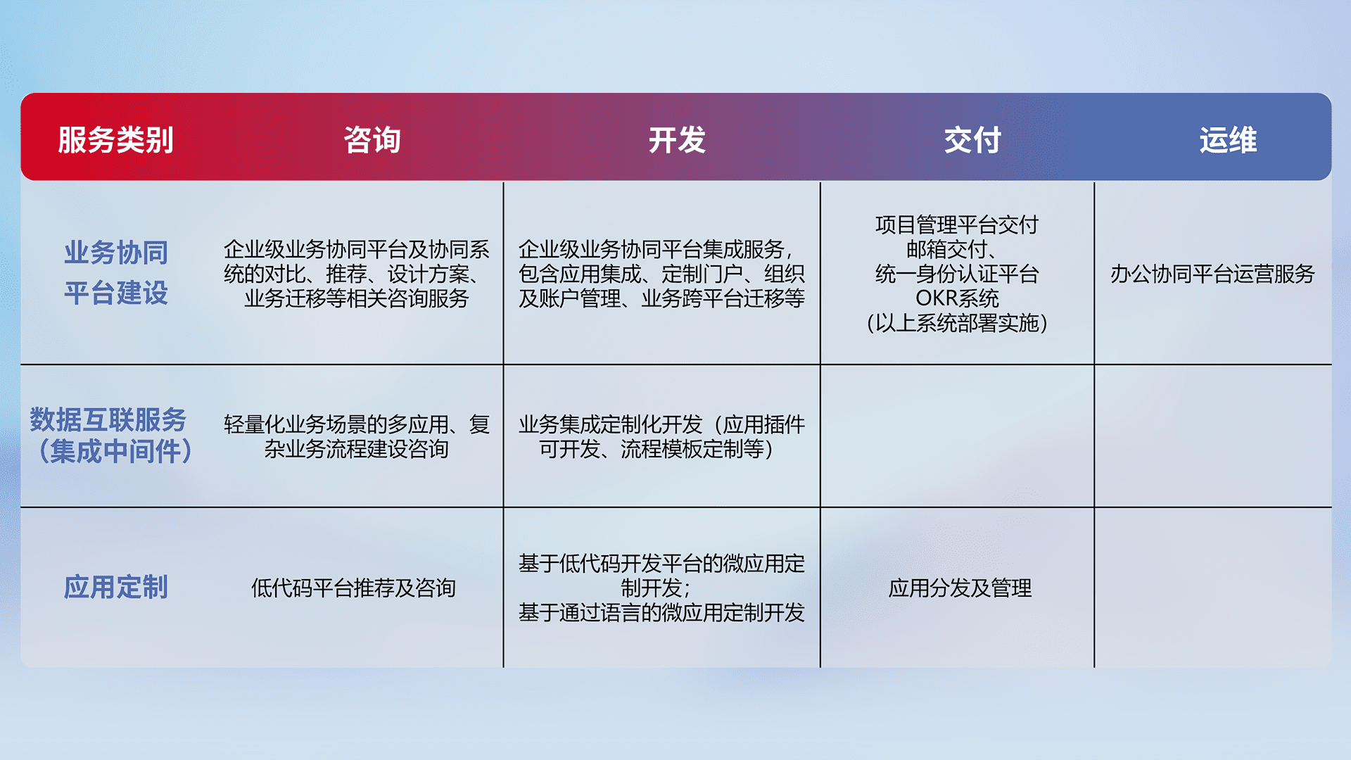 针对钉钉、、企微、、、IDaas等平台级产品提供产品的规划、、、方案、、交付、、定制化开发等服务,,实现如统一协同办公、、、智能客户服务、、混合会议管理、、、、智能数据查询、、、、等业务场景,,,,实现数字化转型。。